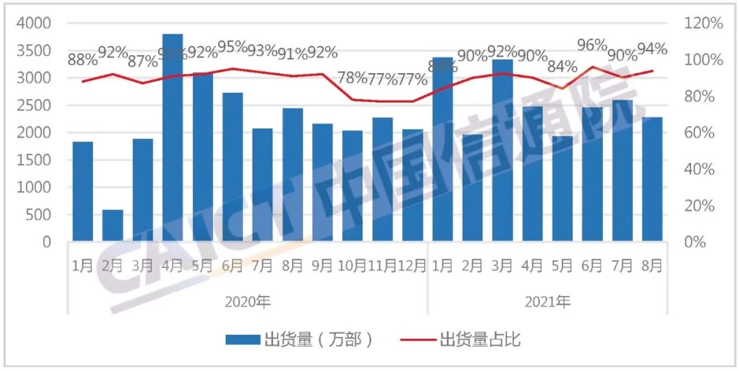 2021年1-8月,国内商场手机整体出货量累计2.27亿部,同比增加12.3%,其间,5G手机出货量1.68亿部,同比增加79.7%,占同期手机出货量的74.1%。
