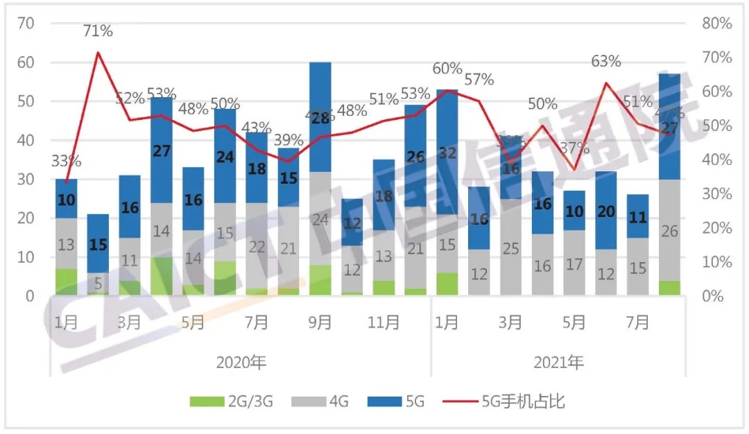 2021年8月,国内手机上市新机型57款,同比增加50.0%,其间5G手机27款,同比增加80.0%,占同期手机上市新机型数量的47.4%。